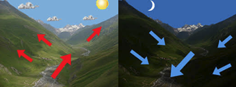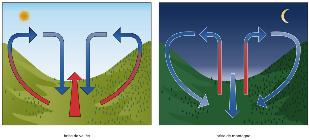 - Les pentes et fonds de vallées se réchauffent, l’air s’élève et crée une aspiration d’air venant du bas de la vallée.