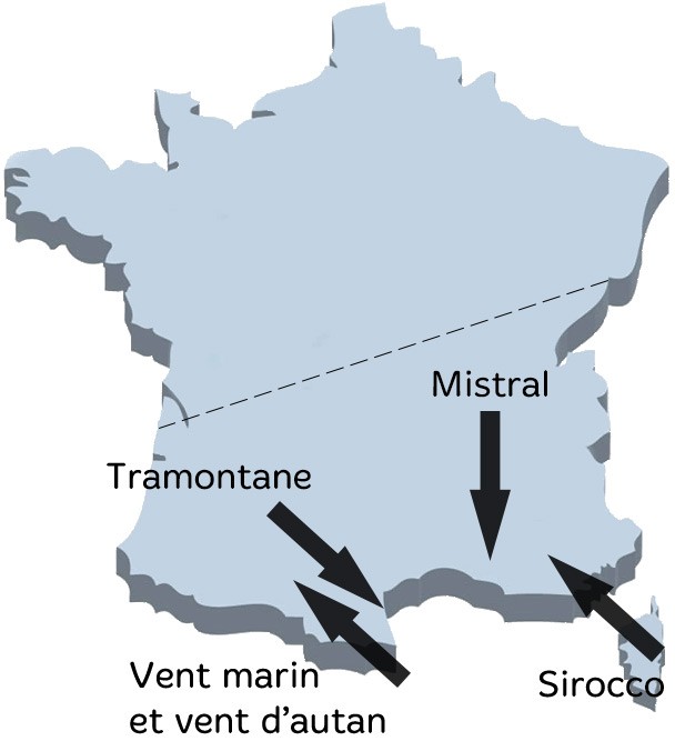 | Marin / Autan | Météo / Dépression méditerranéenne | Sud/SE | Chaud, humide |