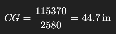 → On vérifie dans le diagramme que 44.7 in est dans les limites pour 2580 lb (ok pour un C172S, par exemple entre 35–47 in).