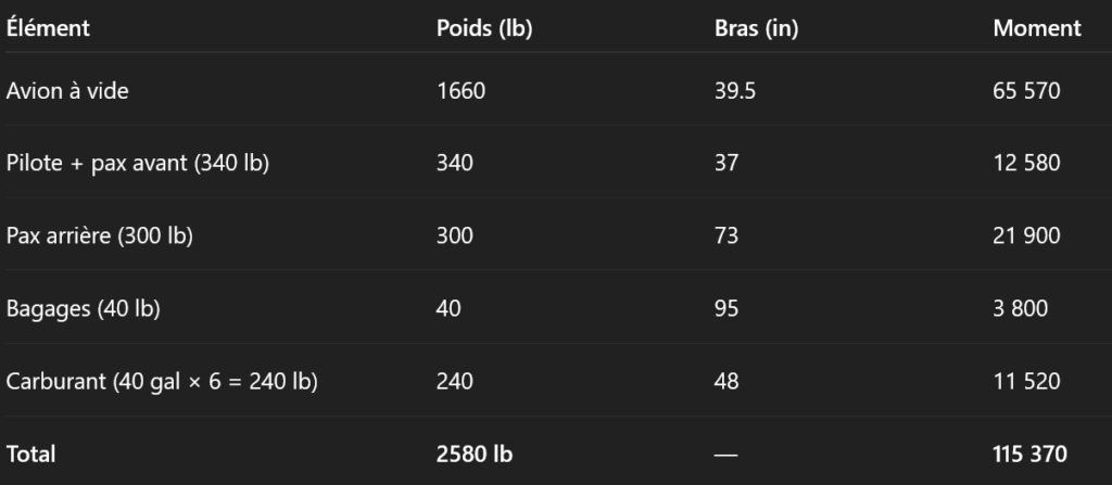 Avec le centrage (en pouces) et le poids total, on place le point correspondant dans le diagramme masse/centrage du manuel de vol (POH).