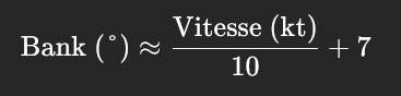 Ex : à 120 kt → inclinaison ≈ 12 + 7 = 19°.