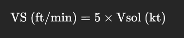 VS plan 3° | VS = ½ Vsol × 10 | 120 kt → 600 ft/min |